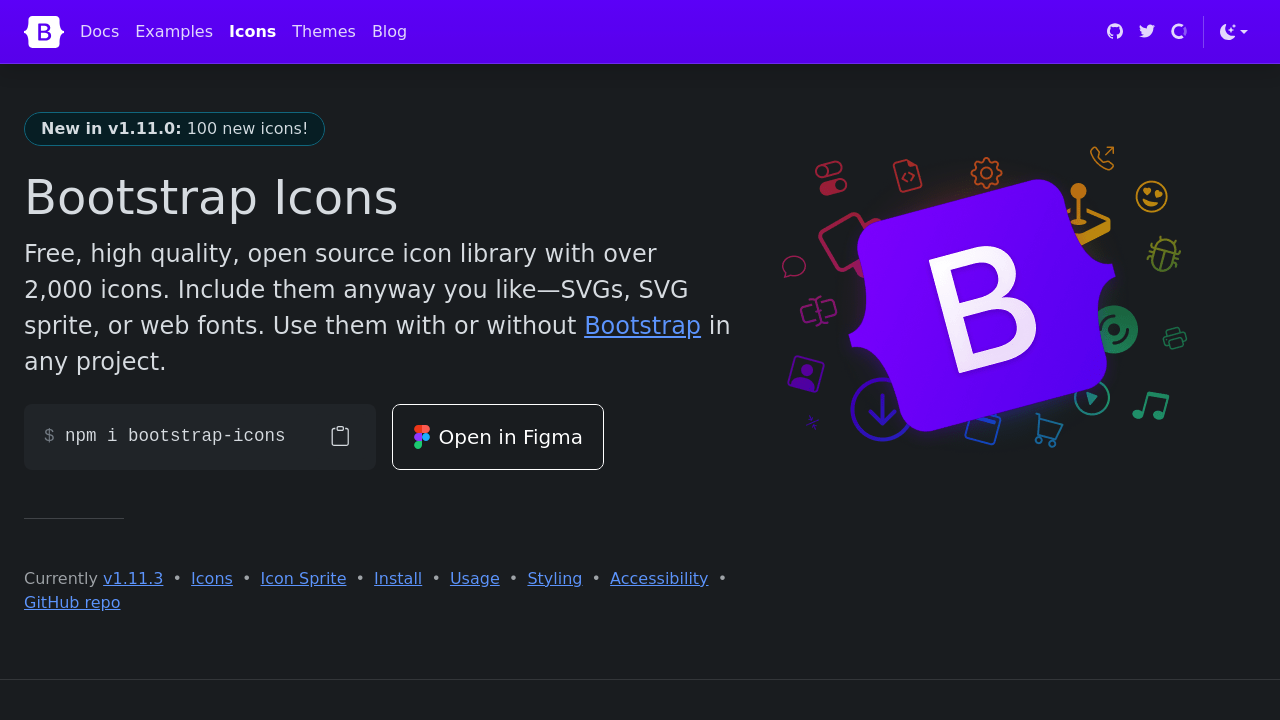 Bootstrap Icons is a free, high quality, open source icon library with over 2,000 icons. You can include them in your project in several ways—SVGs, SVG sprite, or web fonts. These icons can be used with or without Bootstrap in any project.