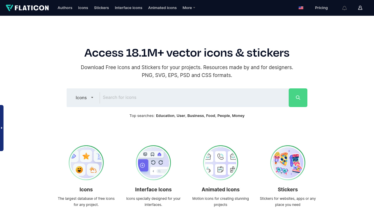 Flaticon offers a vast library of over 18.1 million vector icons and stickers, available in various formats such as PNG, SVG, EPS, PSD, and CSS. It's a go-to resource for designers seeking high-quality, customizable assets for their projects.